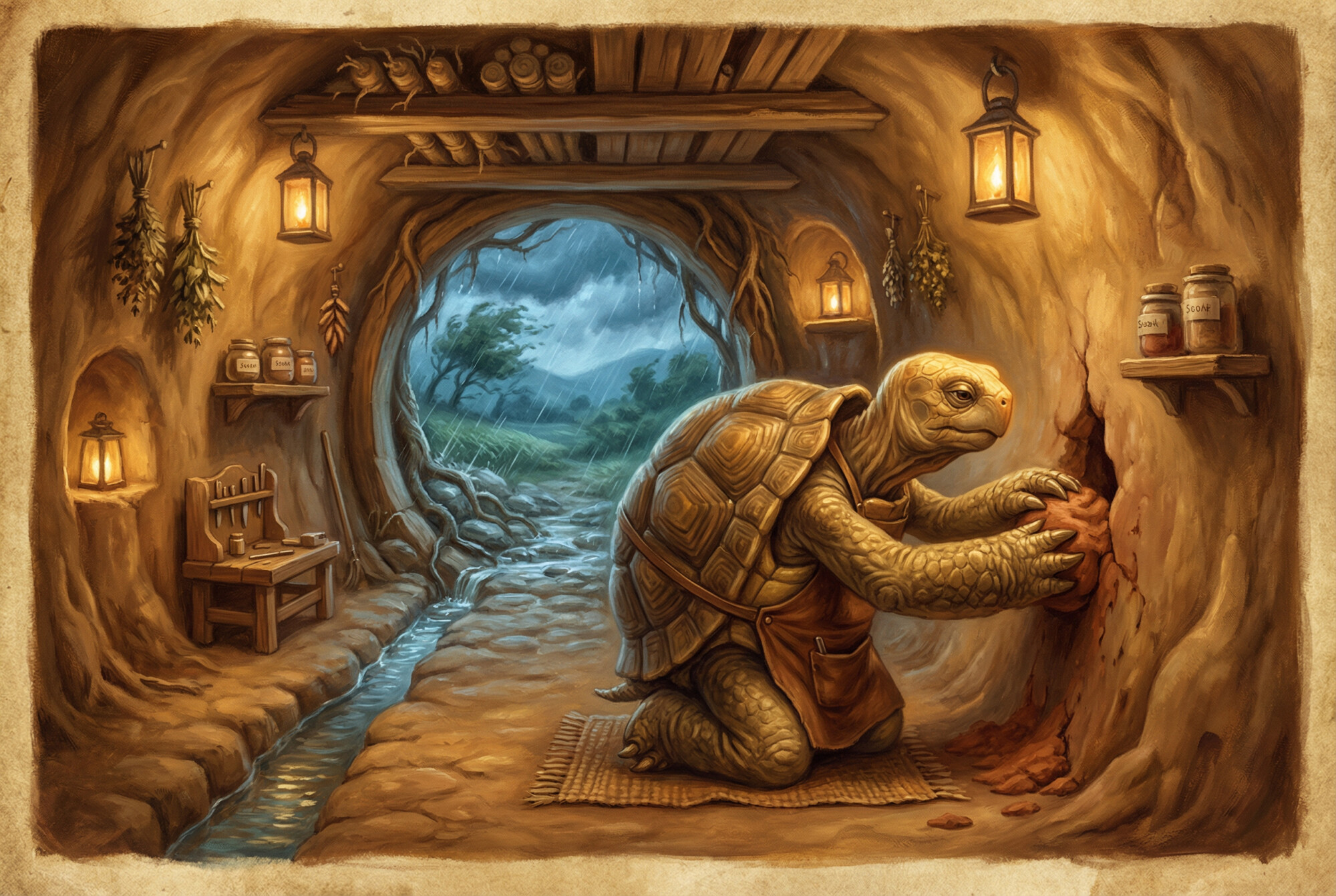 The tortoise looked up slowly. “Every year,” he said, “I dig a small drainage channel along the uphill side and clear the old one of roots and debris. Then I pack fresh clay into the walls where the frost has loosened them, and check the ceiling for root intrusion, trimming anything that might hold moisture. I have done it every spring for forty years. It takes me three days each time.”
